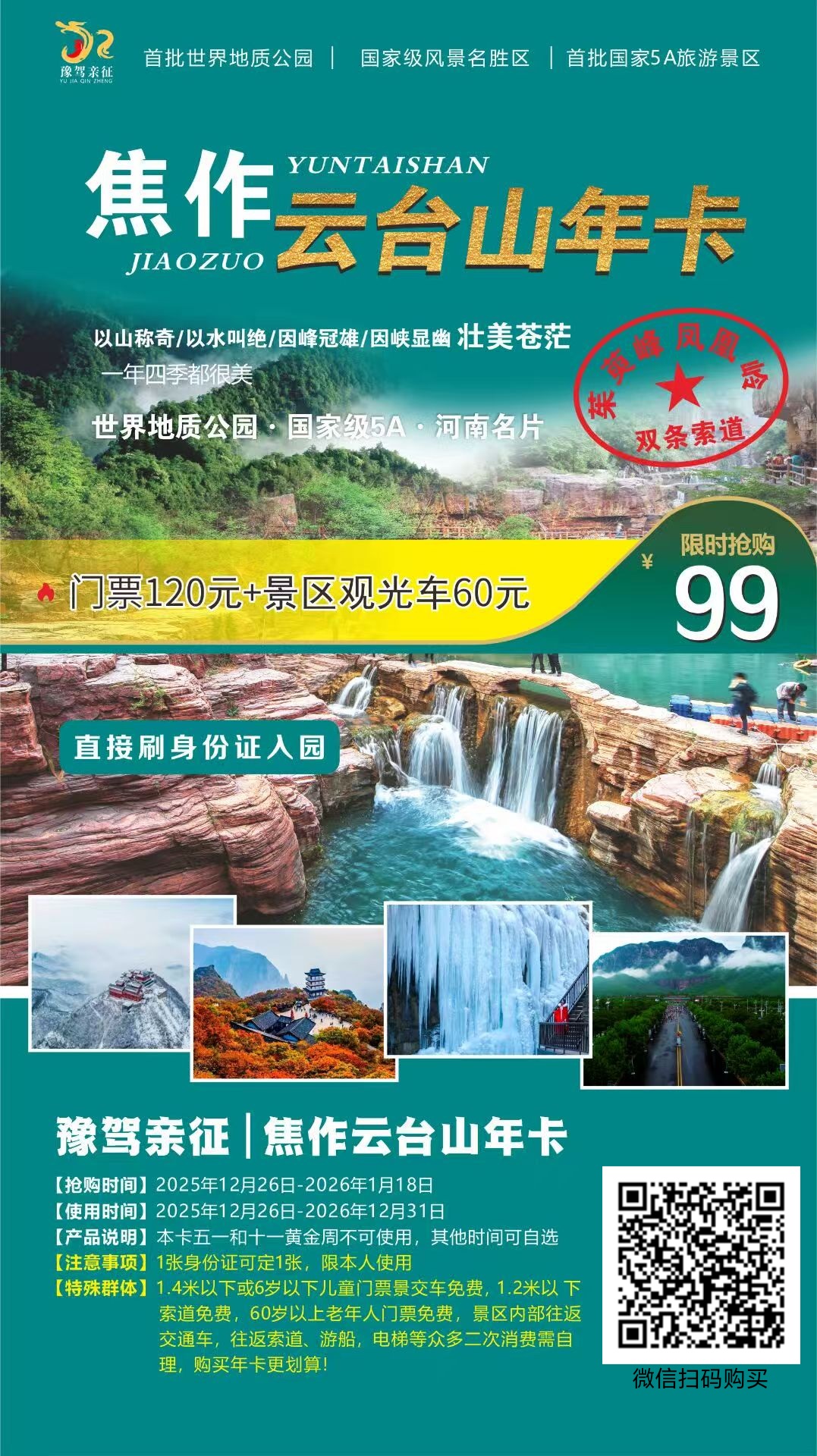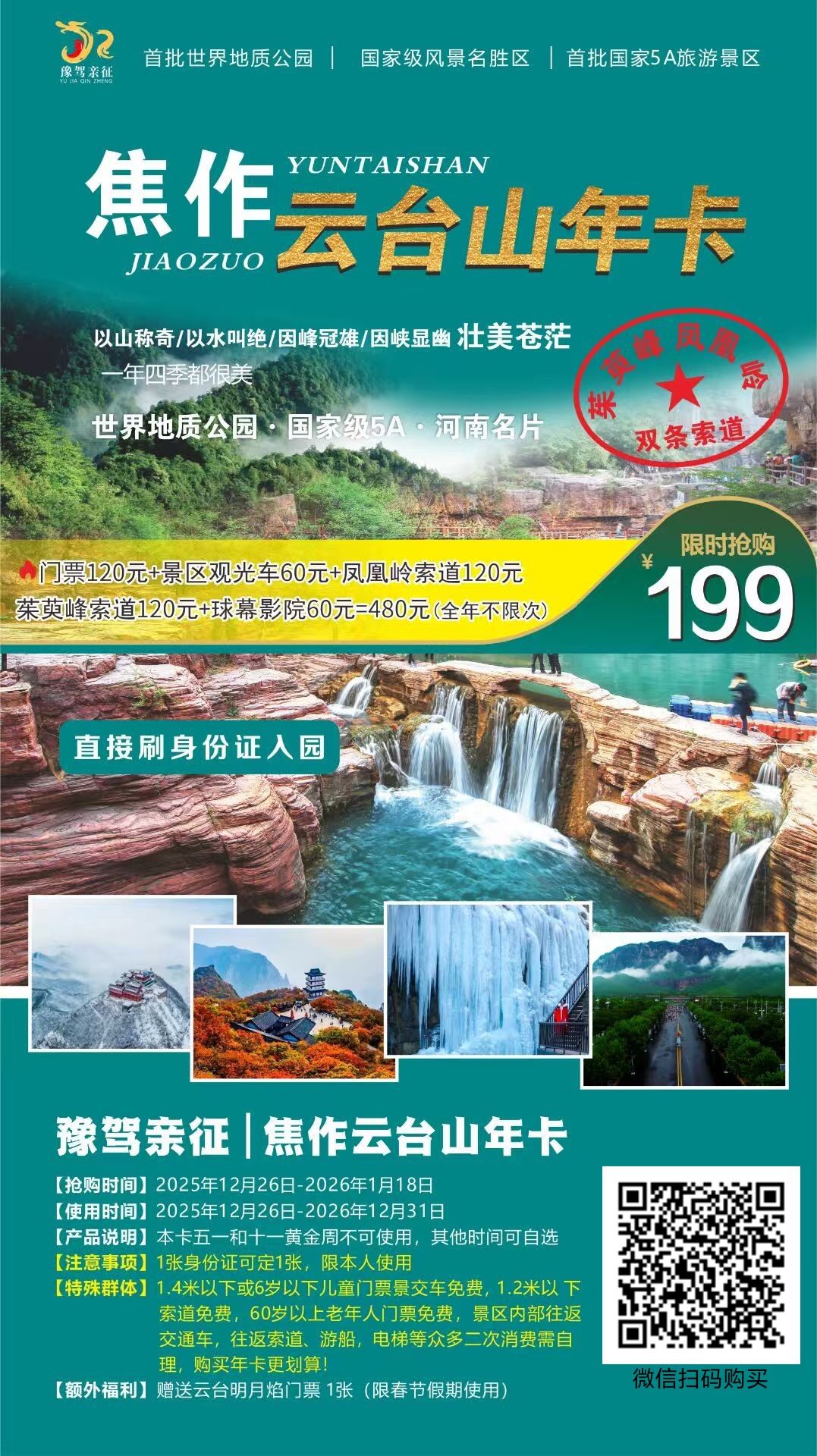 权益:包含云台山景区门票+车票+往返索道+球幕影院,以及云台明月焰春节假期入园一次